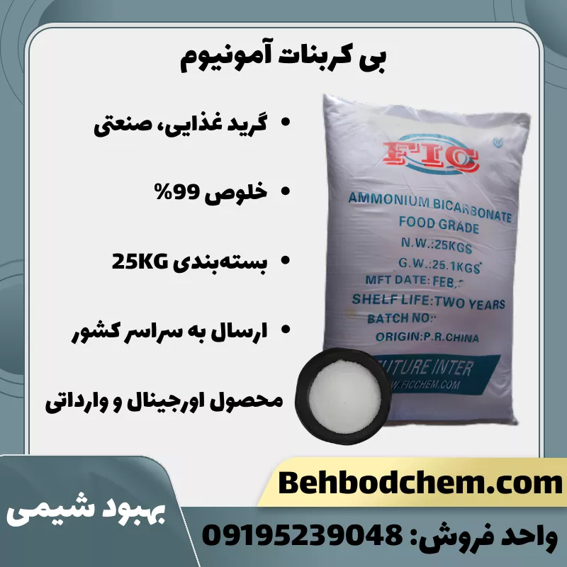 جهت خرید بی کربنات آمونیوم (Ammonium Bicarbonate) برند FIC چین در بسته بندی های 25 کیلوگرمی به همراه آنالیز و قیمت فروش با کارشناسان شرکت بهبود شیمی در تماس باشید.
